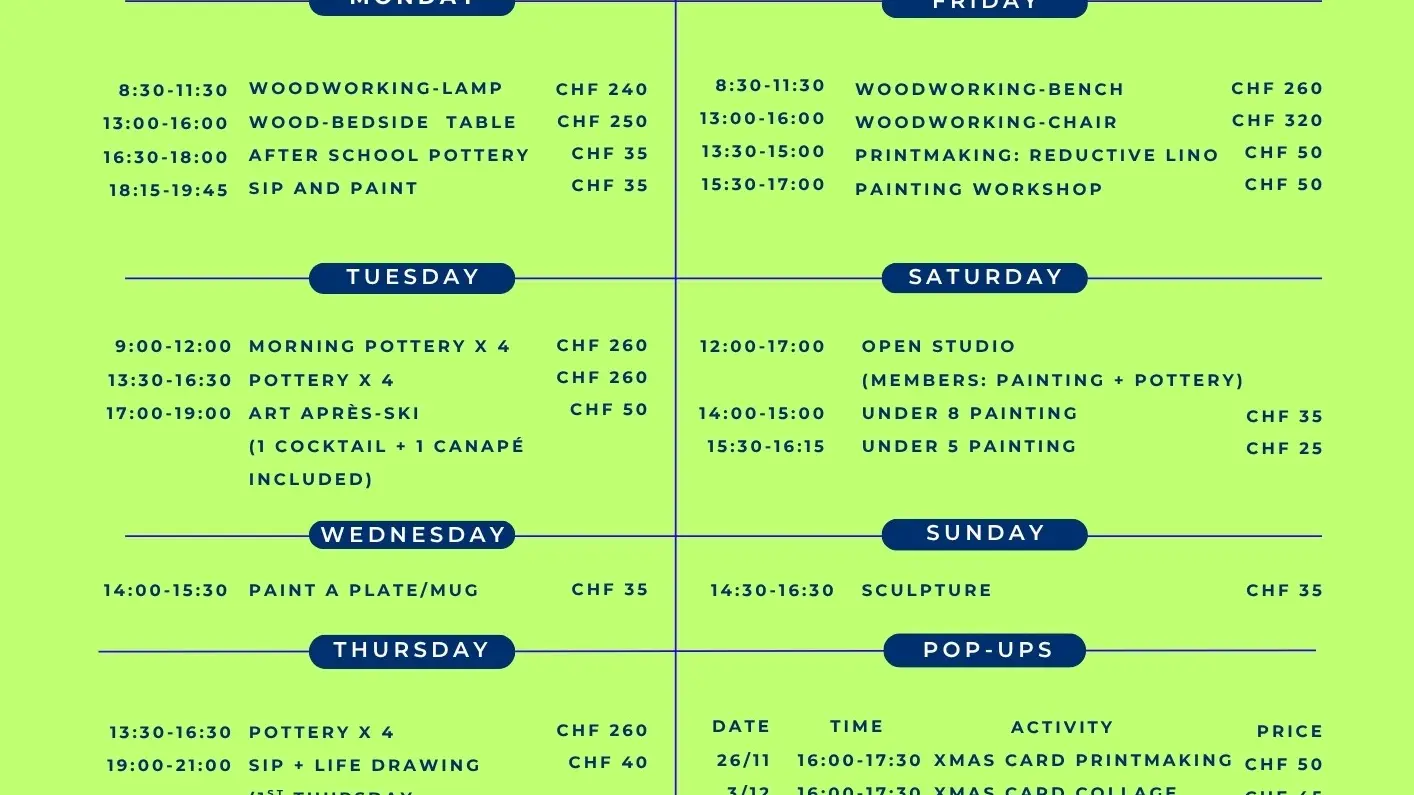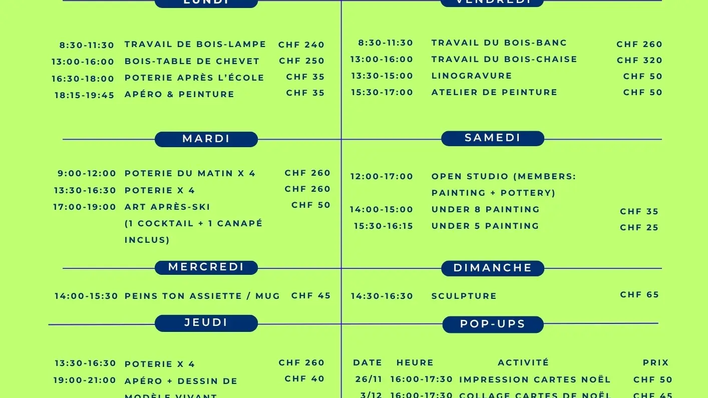 Das Atelier bietet Kurse und Workshops in Keramik, Malerei, Linolschnitt, Zeichnung, Skulptur und Holzarbeit an, geleitet von engagierten Künstlerinnen, Künstlern und Lehrenden. Offene Atelierzeiten ermöglichen es Einheimischen und Besucherinnen sowie Besuchern, selbstständig in einer einladenden und gut ausgestatteten Umgebung zu arbeiten.