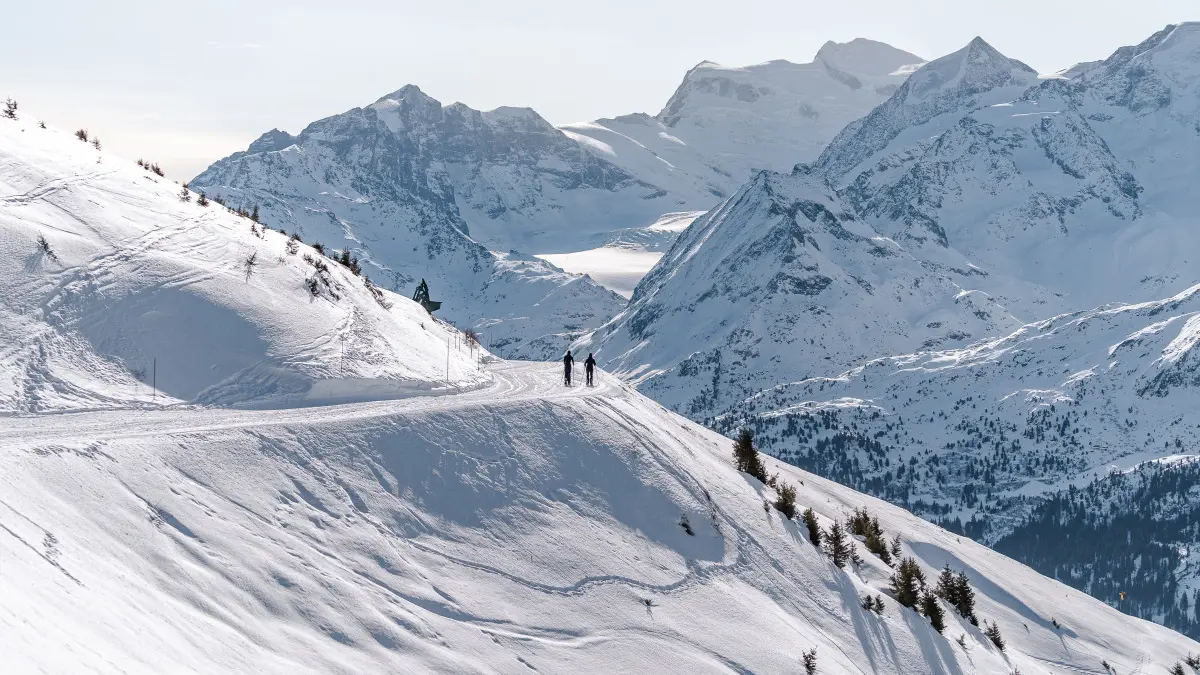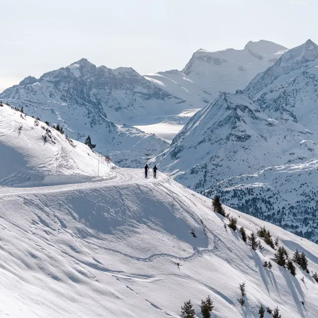 Abfahrt von Médran in Verbier mit Gondeln bis nach Les Ruinettes. Bei deiner Ankunft wirst du das Restaurant mit dem Namen Le Mouton Noir sehen. Der Weg, dem du folgen musst, befindet sich unterhalb dieses Lokals und ist mit rosafarbenen Pflöcken markiert. Dieser Weg, der am Hang entlangführt, bringt dich nach La Chaux, wo sich das Combins-Massiv im Laufe des Weges entfaltet. An diesem Punkt hast du bereits die erste Etappe des Weges zurückgelegt und hast die Möglichkeit, im Restaurant Le Dahu, das du zu deiner Linken siehst, einzukehren.