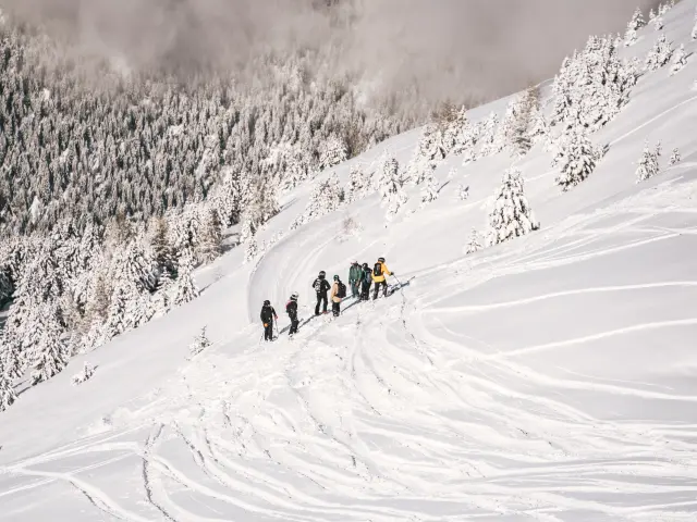 Fahrspur der vorderen Skifahrer und Snowboarder respektieren.