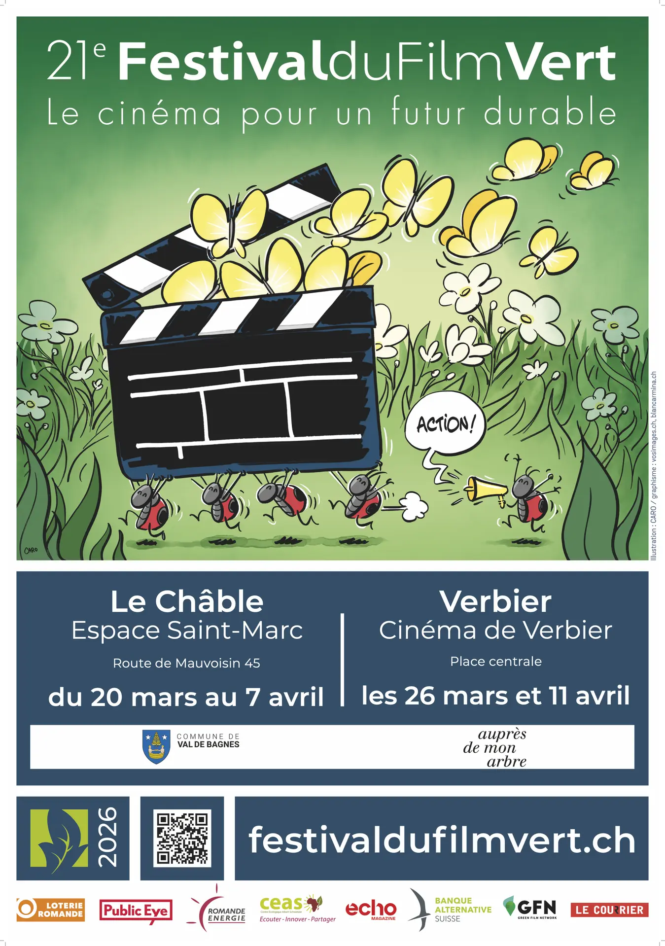 Die zweite Ausgabe des Festival du Film Vert, organisiert vom Verein imAGIne, findet vom 20. März bis 12. April im Val de Bagnes statt. Die Veranstaltung bietet sechs Filmvorführungen rund um Umwelt, ökologischen Wandel und bürgerschaftliches Engagement, jeweils gefolgt von Diskussionen und geselligen Rahmenprogrammen.