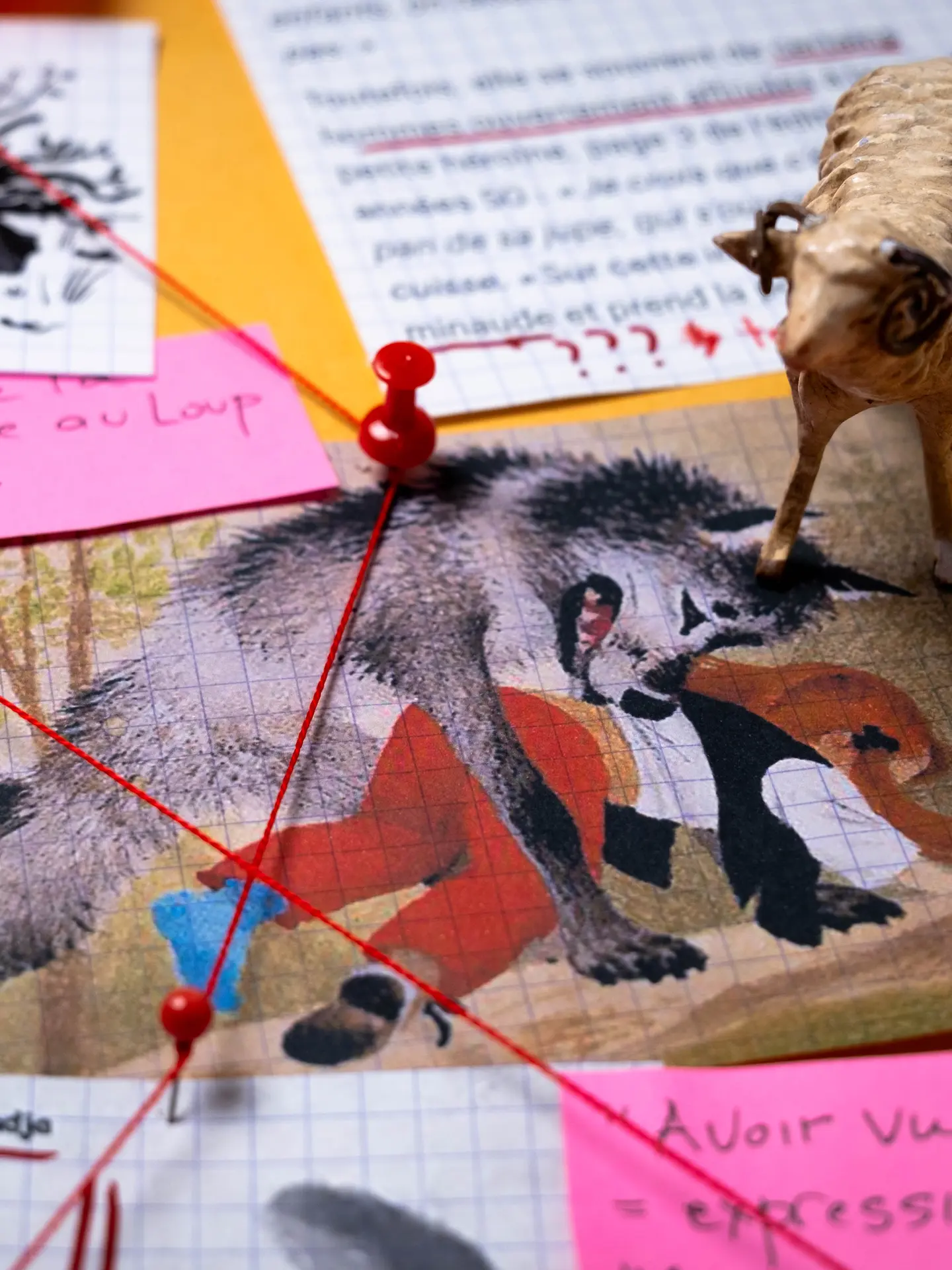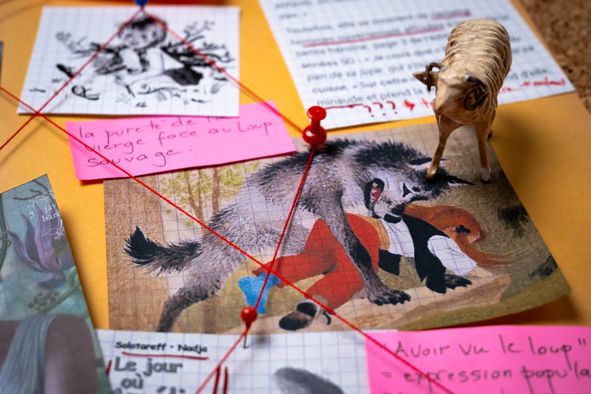 Die Verunsicherung zwischen den Kategorien des Häuslichen und des Wilden tritt im Vertrauten der Lebensräume zutage: ein Wohnzimmer der Koexistenz zwischen Menschen und Wölfen im Laufe der Zeit, ein Garten, in dem Hund und Wolf die Bedeutung der Evolution „ausspielen“, Schlafzimmer der Bindungen, der Prädation und der Transformation. Ein Weg, auf dem die Wölfe der Bestiarien – taxidermiert, in thermischen Bildern oder als Plüschfiguren – aufeinandertreffen, als ebenso viele Präsenzen, die eine lupine Welt beobachten lassen, verbunden mit der menschlichen Welt.