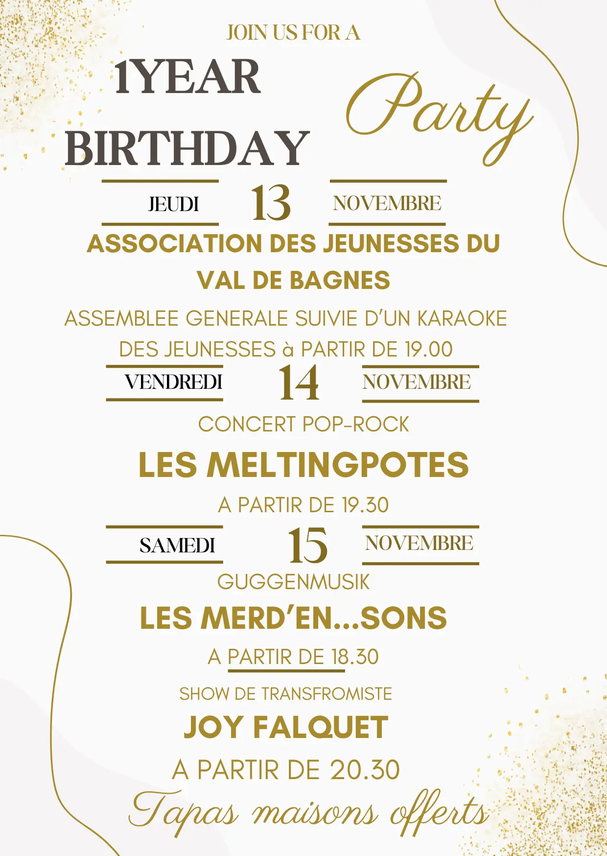 Samedi 15 novembre, Guggenmusik, LES MERD'EN...SONS 18.30, SHOW TRANSFORMISTE avec JOY FALQUET 20.30