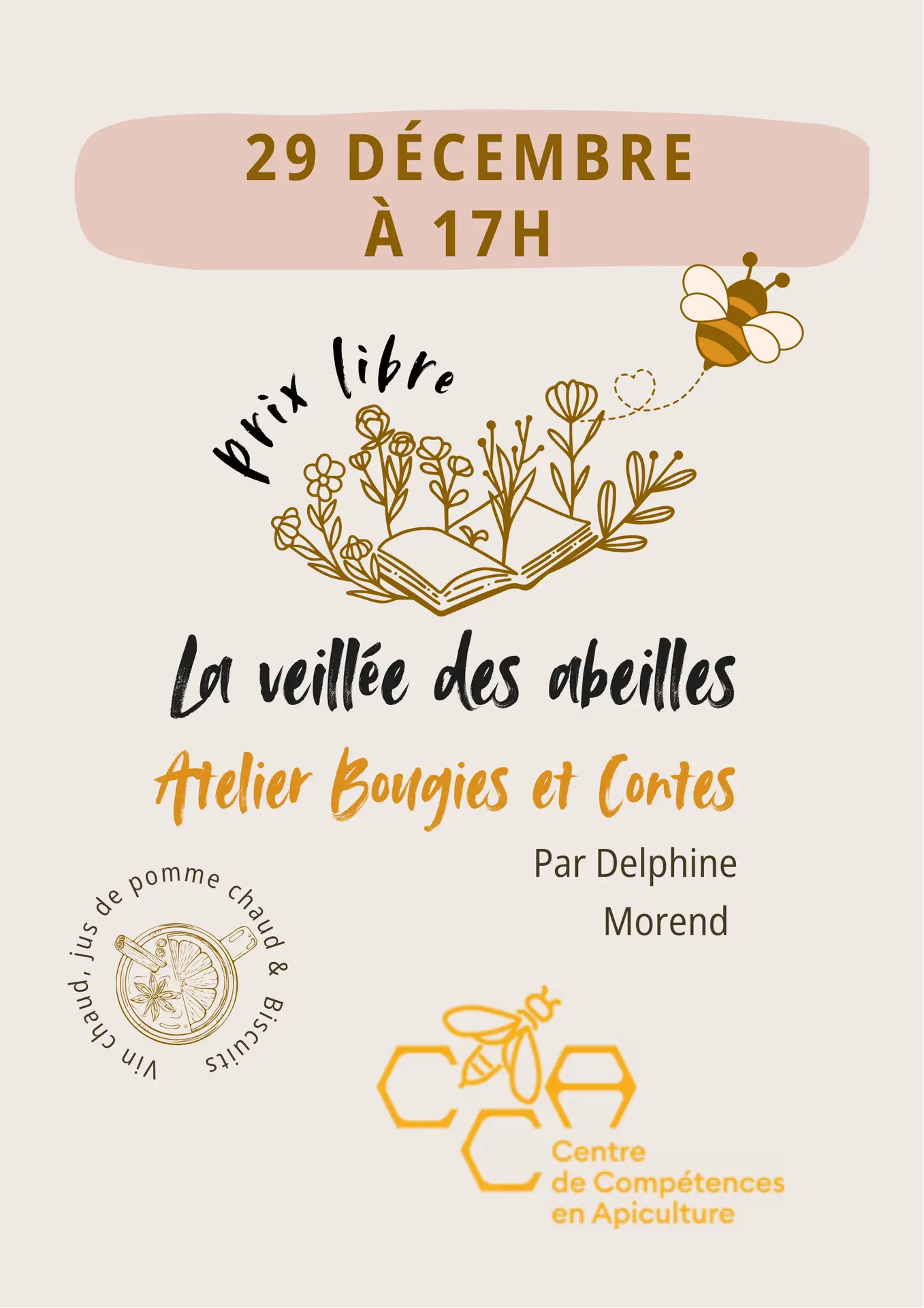 Le 29 décembre à 17h, rejoignez-nous au Centre de Compétences en Apiculture pour une soirée chaleureuse : atelier bougies en cire d’abeille, contes nature par Delphine Morend, tisanes, vin chaud, jus de pomme chaud et douceurs d’hiver.