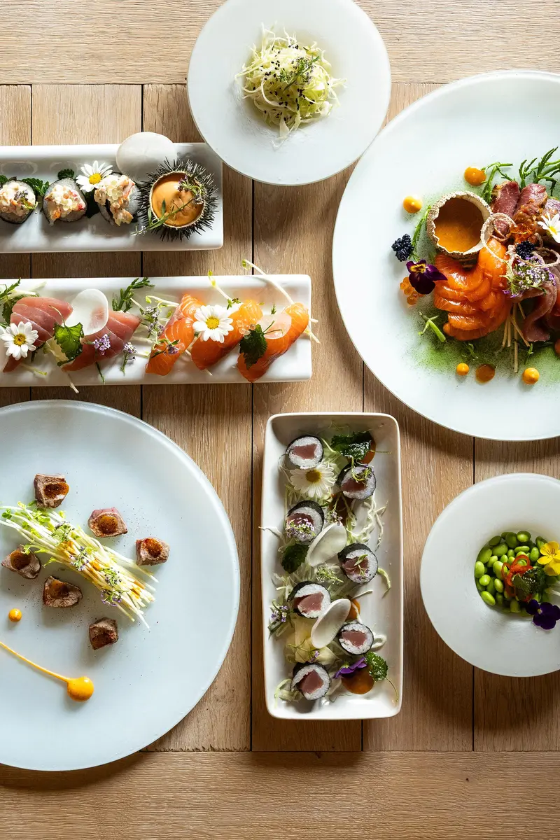 Chaque pièce est préparée à la minute – makis, nigiris, sashimis et rouleaux signatures imaginés avec du poisson des Alpes suisses et des herbes locales. L’ambiance est intime et détendue, où chaque détail respire la simplicité et le raffinement.